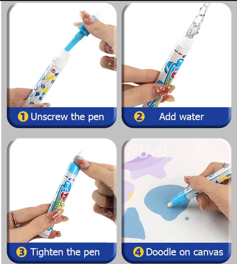 Simply fill the included magic pens with clean water, draw on the mat, and watch colorful patterns.